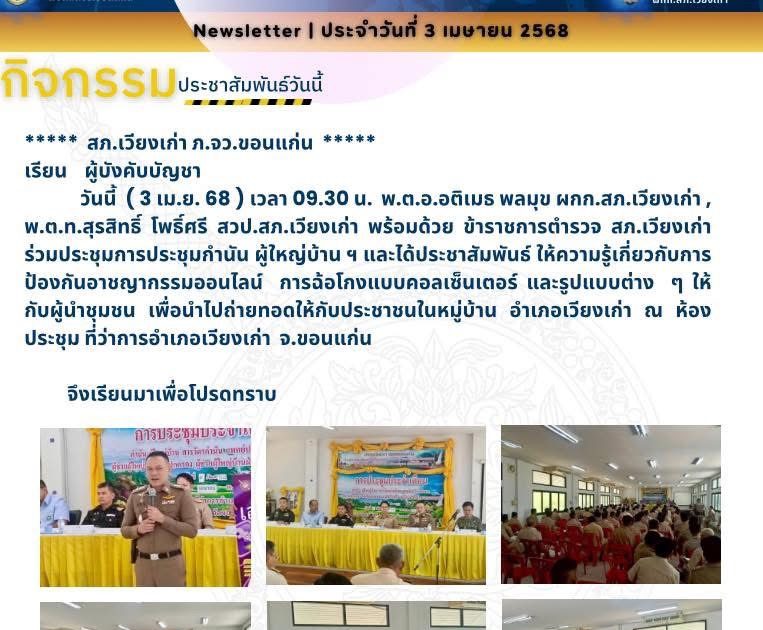 วันนี้ ( 3 เม.ย. 68 ) เวลา 09.30 น. พ.ต.อ.อติเมธ พลมุข ผกก.สภ.เวียงเก่า , พ.ต.ท.สุรสิทธิ์ โพธิ์ศรี สวป.สภ.เวียงเก่า พร้อมด้วย ข้าราชการตำรวจ สภ.เวียงเก่า ร่วมประชุมการประชุมกำนัน ผู้ใหญ่บ้าน ฯ และได้ประชาสัมพันธ์ ให้ความรู้เกี่ยวกับการป้องกันอาชญากรรมออนไลน์ การฉ้อโกงแบบคอลเซ็นเตอร์ และรูปแบบต่าง ๆ ให้กับผู้นำชุมชน เพื่อนำไปถ่ายทอดให้กับประชาชนในหมู่บ้าน อำเภอเวียงเก่า ณ ห้องประชุม ที่ว่าการอำเภอเวียงเก่า จ.ขอนแก่น