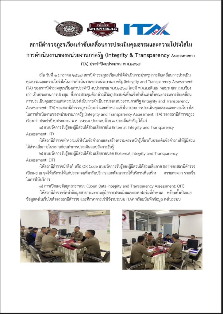 การประชาสัมพันธ์ข้อมูลผลการดำเนินงานการประเมินคุณธรรมและความโปร่งใส ในการดำเนินงานของหน่วยงานภาครัฐ (Integrity&Transparency Assessment : ITA) ประจำปีงบประมาณ พ.ศ.2568